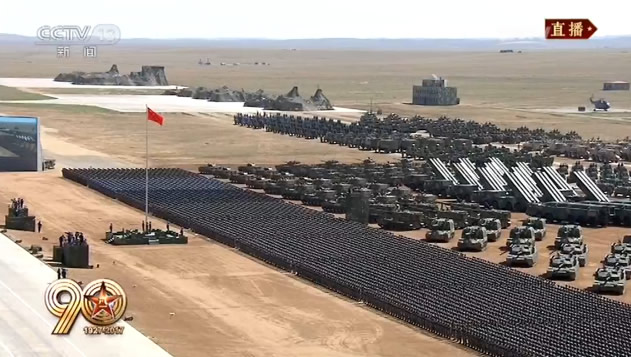 2017年7月30日上午9時(shí),中國(guó)人民解放軍以一場(chǎng)氣勢(shì)磅礴的沙場(chǎng)閱兵慶祝建軍90周年。在朱日和訓(xùn)練基地參加實(shí)戰(zhàn)化訓(xùn)練的三軍將士沙場(chǎng)列陣,以戰(zhàn)斗姿態(tài)接受中共中央總書記、國(guó)家主席、中央軍委主席習(xí)近平檢閱,接受黨和人民檢閱。朱日和,這個(gè)蒙古語(yǔ)意為心臟、勇氣和膽量的地方,烈日灼灼,碧野莽莽。檢閱臺(tái)前“1927—2017”字樣和八一軍徽在陽(yáng)光下熠熠生輝。