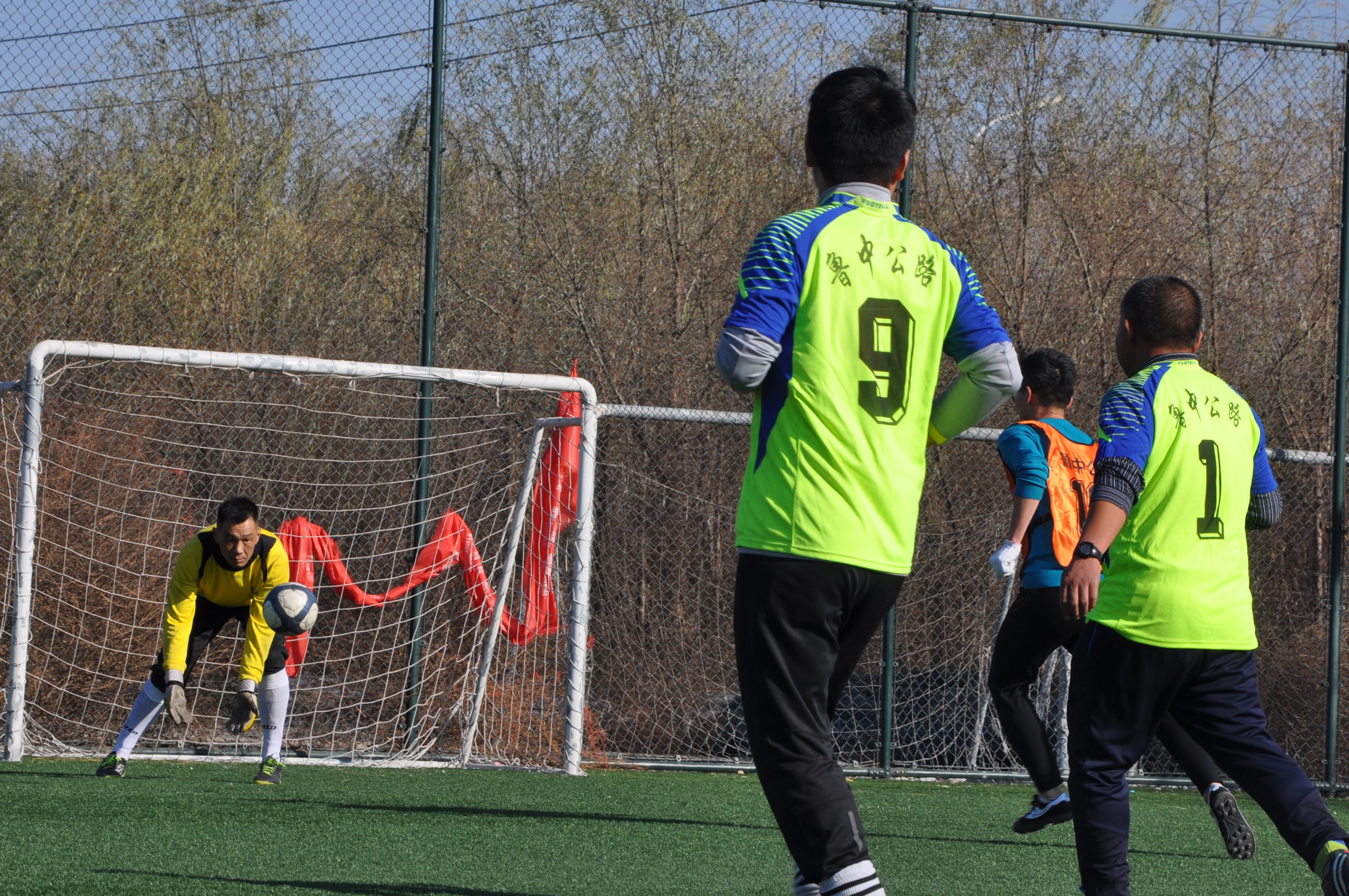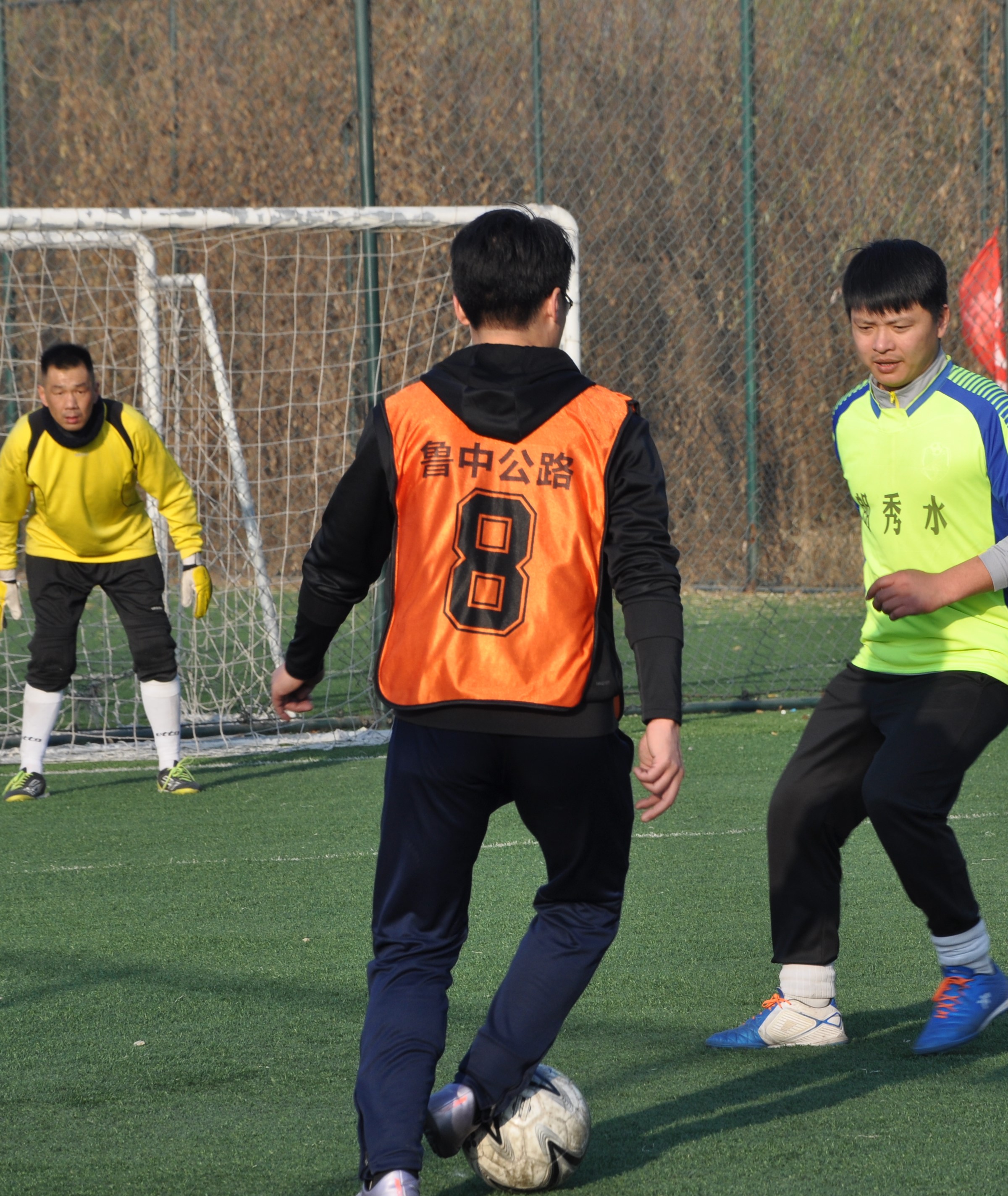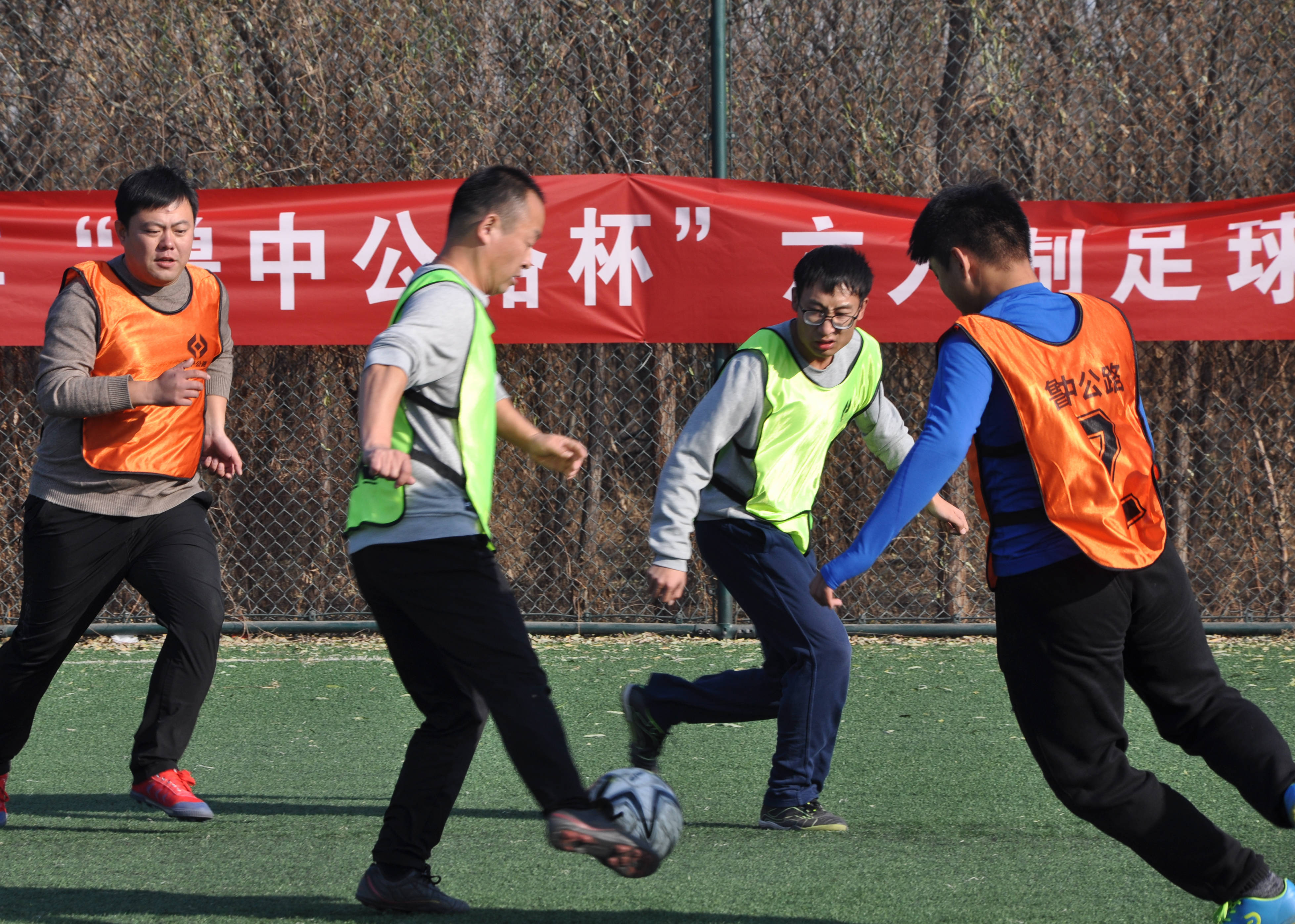 賽場上,隊員們激烈拼搶,盡情發(fā)揮球技,搶斷、過人、射門、撲救……精彩場面一個接一個,大家你追我趕,奮力馳騁。冬日的暖陽灑滿整個綠茵場,賽場上的人們熱情激昂,場下的觀眾也是心情激蕩。賽場周圍被染了金黃的楊柳樹,也仿佛重新煥發(fā)了生機,隨著風的律動,左右搖擺,歡呼雀躍。