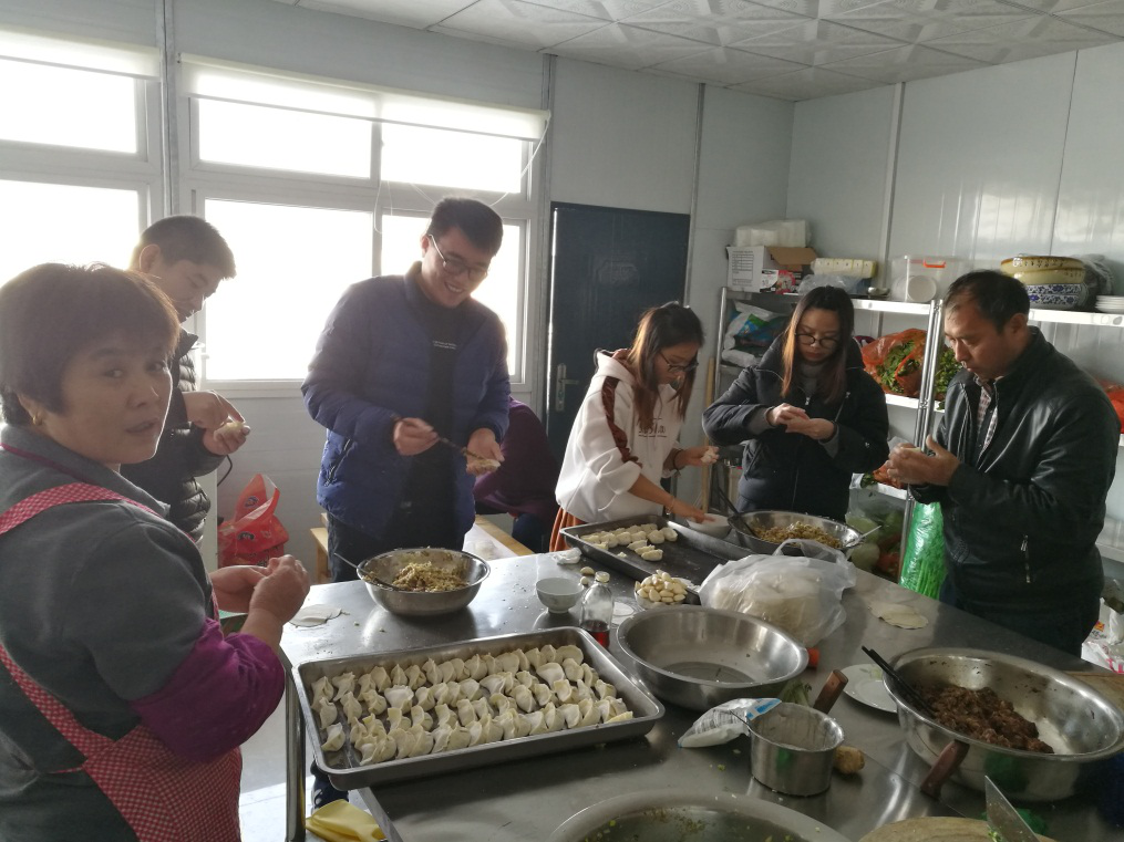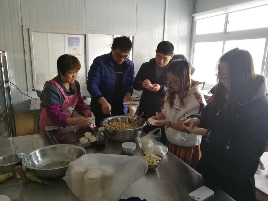 于是,出于為大家的耳朵著想以及滿足大家對(duì)餃子的渴望,今天上午,我們項(xiàng)目部決定中午吃餃子:一起動(dòng)手包餃子、過冬至。雖然主題已經(jīng)定了,但是是關(guān)于吃什么餡的水餃可是大費(fèi)周折,有說蝦仁的、有說羊肉的、有說三鮮的、有說豆腐的……經(jīng)過一番激烈的討論,最終還是“諸肉還是豬肉好,百菜還是白菜香”的白菜肉餡和韭菜肉餡,從眾多候選中脫穎而出。負(fù)責(zé)項(xiàng)目食堂的廚師提前剁好了餃子餡,從市場(chǎng)上買來了餃子皮,我們大家就全副武裝上陣了。