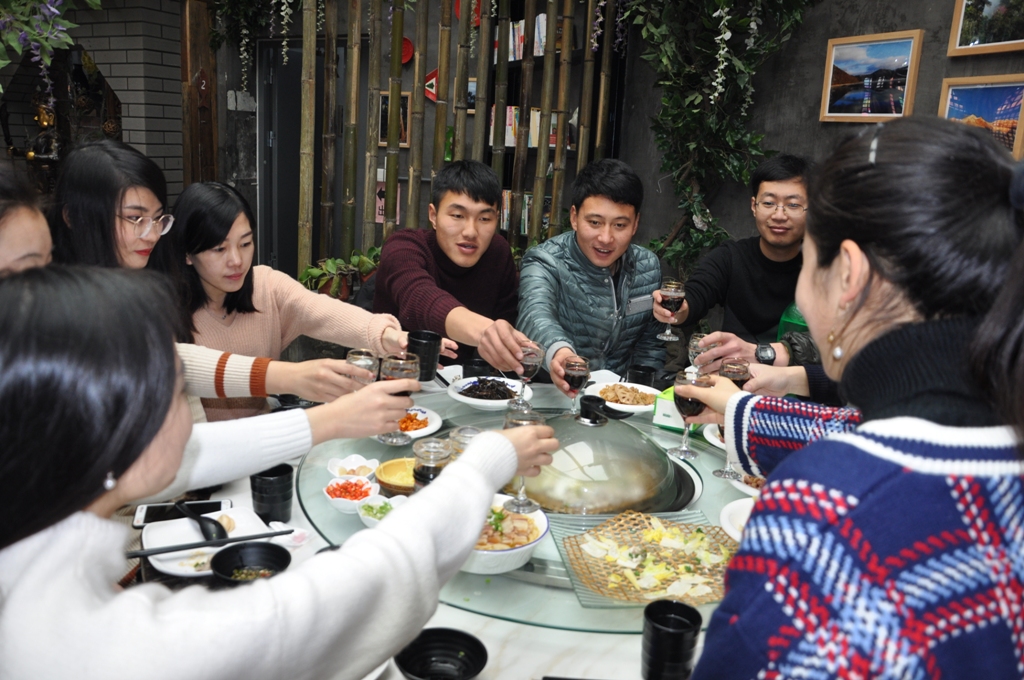 一上午的活動(dòng)充實(shí)又趣味十足。意猶未盡之中,大家離開(kāi)植物園區(qū),前往獨(dú)具特色的“脆肉鯇”餐廳享用午餐。走出室外,雪花已是變大了不少,這讓大家興奮不已,一路追逐著,笑鬧著。沿途經(jīng)過(guò)布滿(mǎn)花燈的鵲橋,大家紛紛合影留念。進(jìn)入餐廳,美味的食物,蔓延的友誼,年青人們觥籌交錯(cuò),開(kāi)懷暢談。幽默的自我介紹,興趣愛(ài)好的相互交流,團(tuán)坐在暖暖的蒸鍋周?chē)活D飯吃的是熱火朝天。