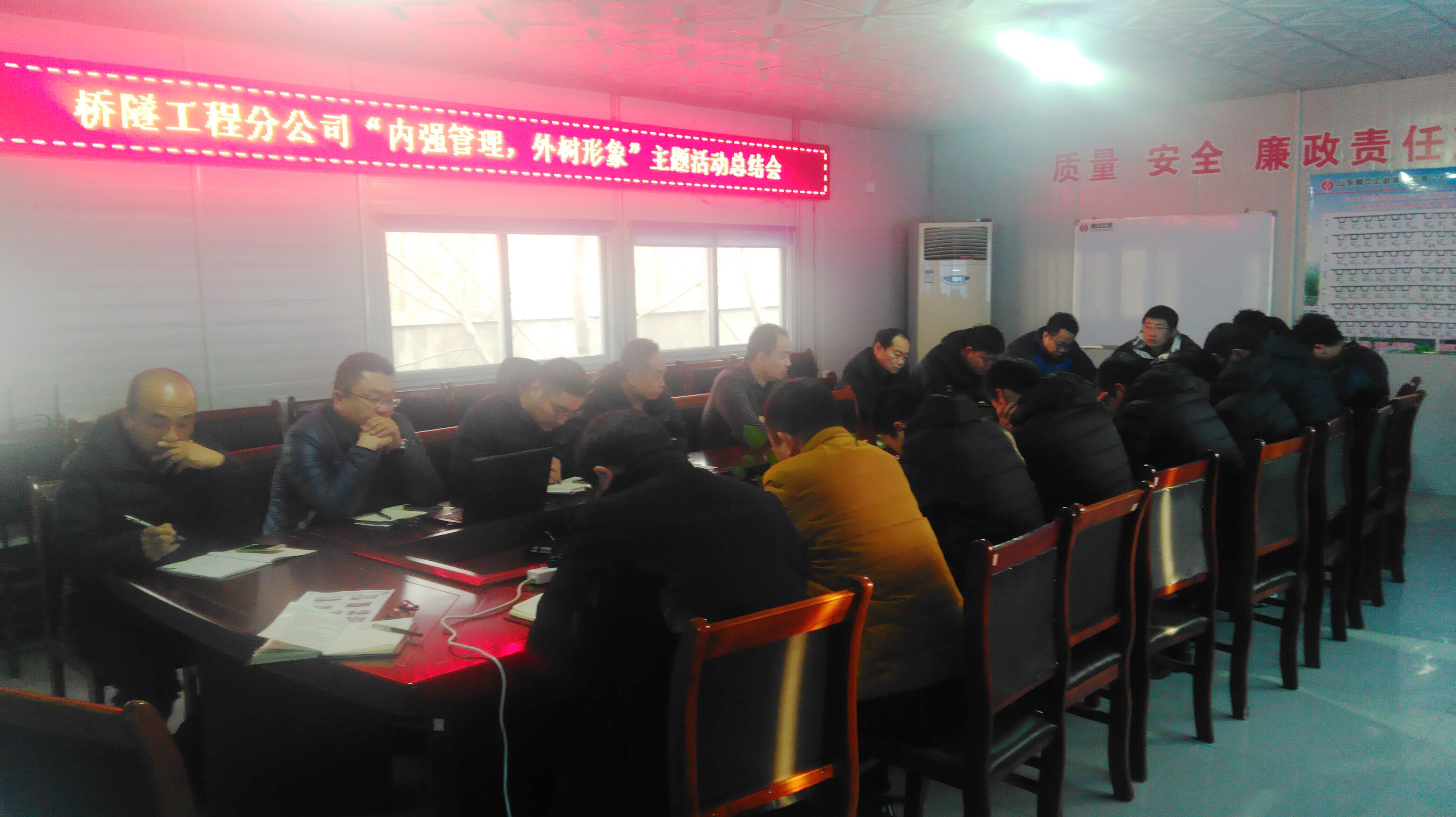 第二天上午八點(diǎn)整,繼續(xù)召開橋隧分公司“內(nèi)強(qiáng)管理、外樹形象”主題活動(dòng)總結(jié)會(huì)。為了全面提升橋隧分公司各項(xiàng)管理工作水平以及樹立良好的外部形象,2017年4月始,在橋隧分公司范圍內(nèi)開展了“內(nèi)強(qiáng)管理、外樹形象”主題活動(dòng),并取得顯著的成效,基本實(shí)現(xiàn)了“新管理、新形象、新業(yè)績”的目標(biāo)。在此期間,橋隧分公司每月都對活動(dòng)開展情況進(jìn)行檢查,并現(xiàn)場考評(píng)打分,綜合得分最高的單位獲得流動(dòng)紅旗和現(xiàn)金獎(jiǎng)勵(lì)。主題活動(dòng)結(jié)束時(shí),橋隧分公司組織了年度評(píng)比,根據(jù)實(shí)施方案最終評(píng)選出了管理先進(jìn)單位、效益先進(jìn)單位和先進(jìn)個(gè)人,并分別頒發(fā)了獎(jiǎng)牌和榮譽(yù)證書,同時(shí),分公司還將給予一定的物質(zhì)獎(jiǎng)勵(lì)。通過此次活動(dòng)的開展,把主題實(shí)踐活動(dòng)與推動(dòng)業(yè)務(wù)工作有機(jī)結(jié)合,講擔(dān)當(dāng),講團(tuán)隊(duì),講執(zhí)行力,切實(shí)提升了橋隧分公司內(nèi)部管理水平,全面塑造了積極向上、朝氣蓬勃的橋隧分公司新形象,從而保證了2017年度各項(xiàng)工程任務(wù)圓滿完成!