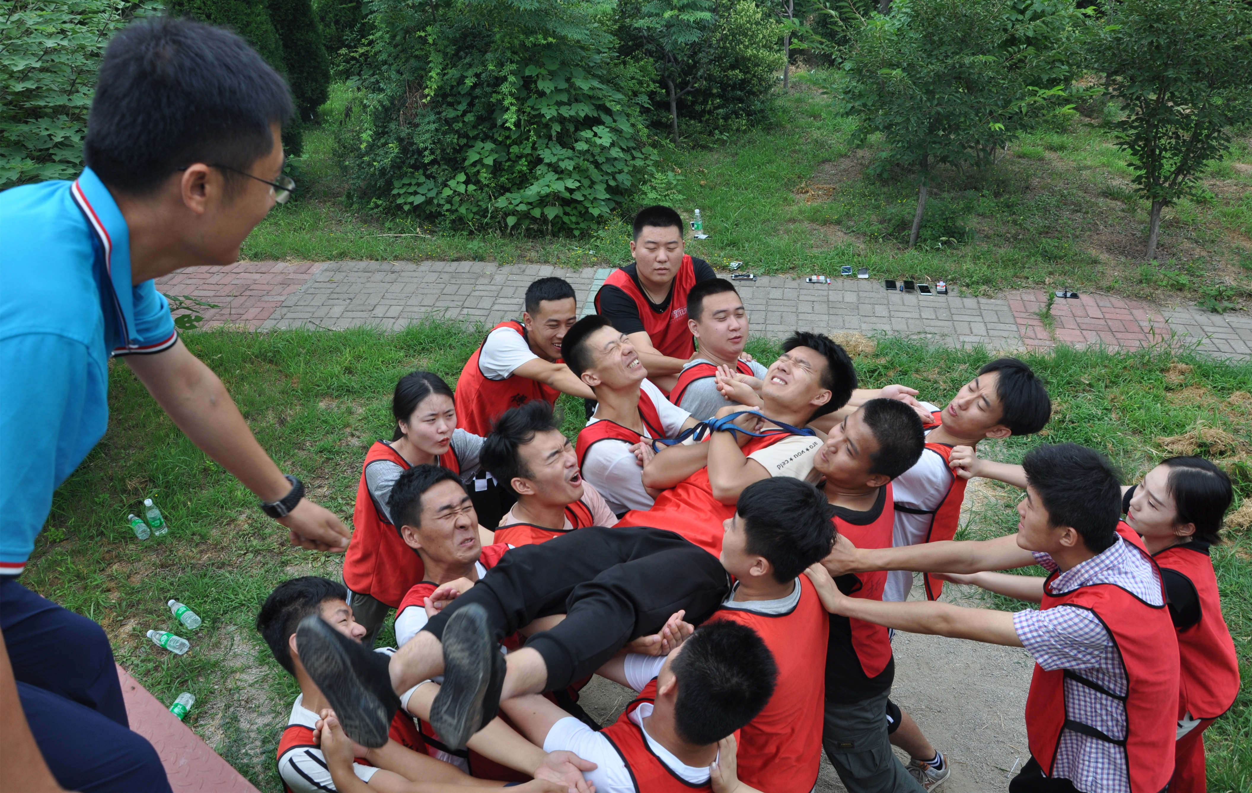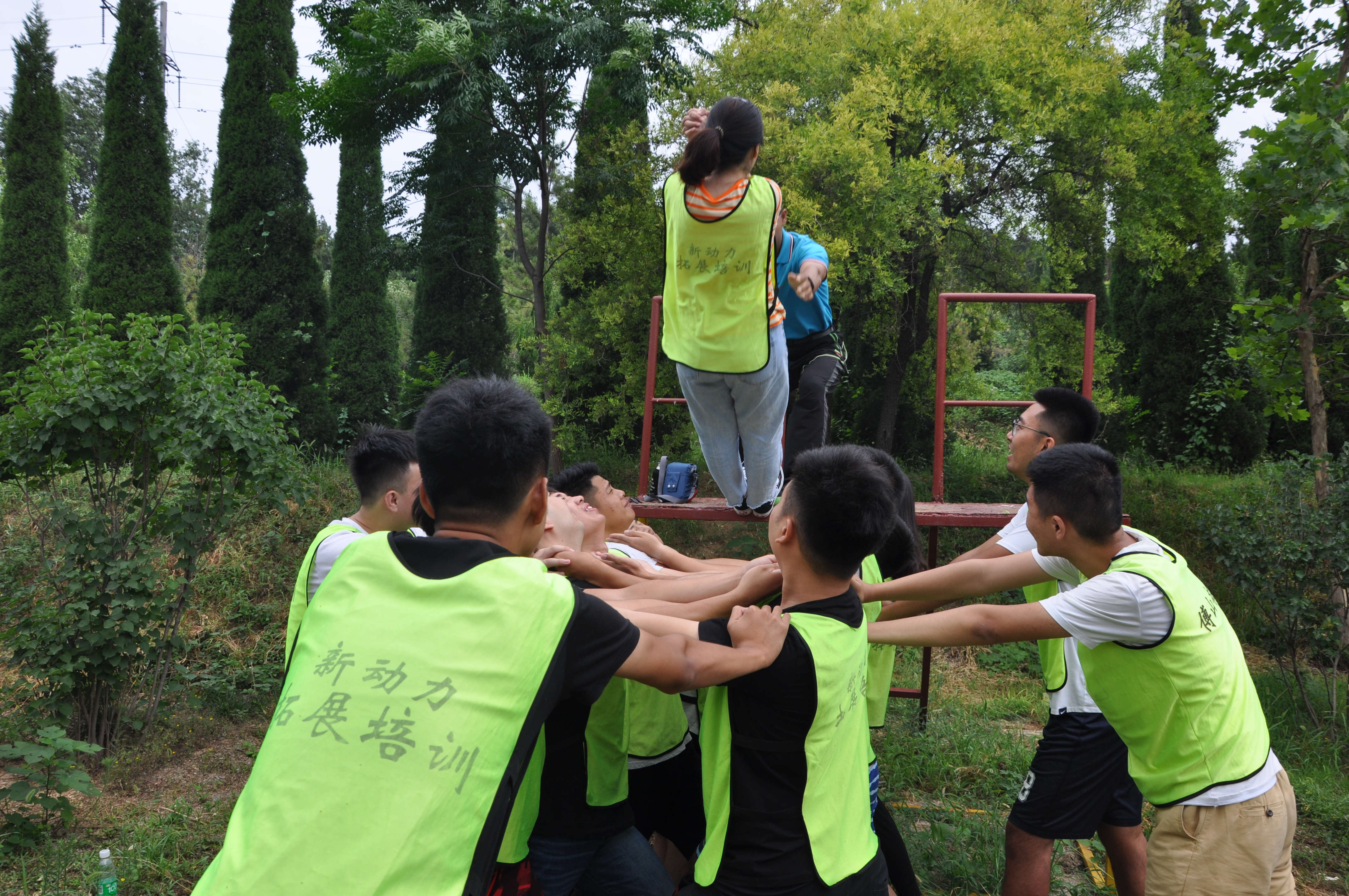 信任背摔項目中,隊友們搭起堅實的人床,保證挑戰(zhàn)隊員的安全
