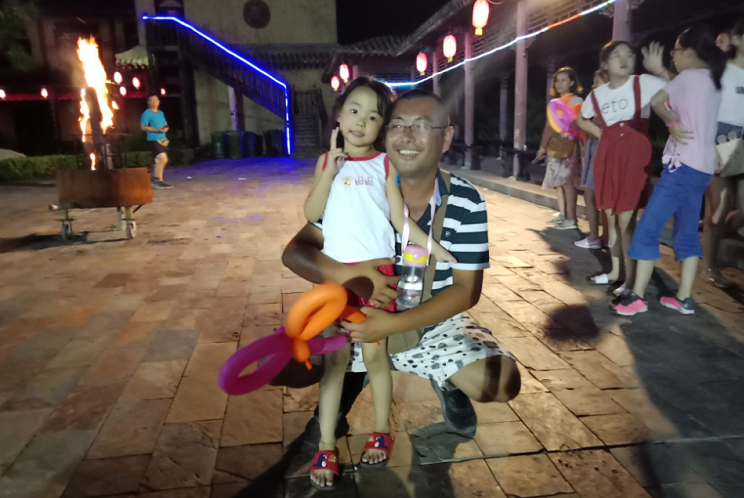 晚上在“淘金小鎮(zhèn)”參加篝火晚會(huì),跟女兒同事們一起做“蘿卜蹲”的游戲。一晚上,同事們的歡鬧聲,孩子們的嬉戲聲,熱鬧一片。突然發(fā)現(xiàn)我們這些大人們放松下來(lái)竟然比孩子還可愛(ài)。晚上女兒跟我說(shuō):“爸爸,沒(méi)想到你活動(dòng)起來(lái)這么靈活,一點(diǎn)也不像是個(gè)大胖子呀”。突然之間覺(jué)得她長(zhǎng)大了,都說(shuō)起大人話了。女兒長(zhǎng)這么大,我陪她的時(shí)間屈指可數(shù),幾乎都不知道怎么跟她相處,幸虧有同事的幫忙和照顧,雖然心里有愧疚但是更多的是驚喜,驚喜女兒已經(jīng)逐漸長(zhǎng)大,變得懂事,有時(shí)候還很體貼。