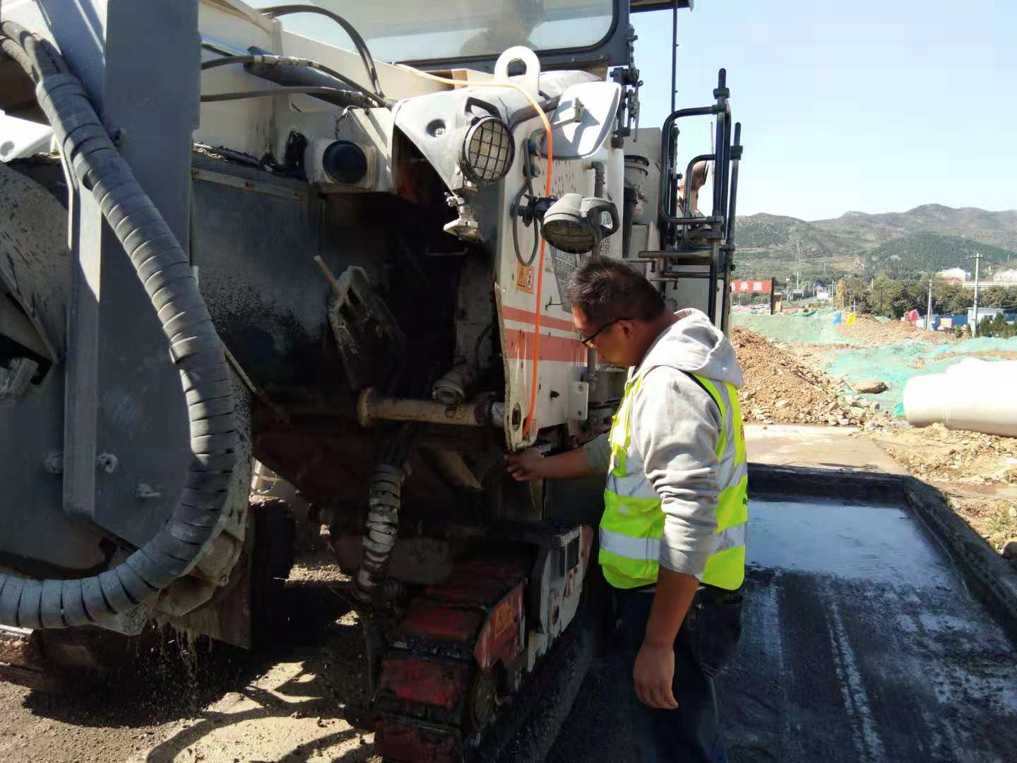 在人民路路面銑刨過程中,侯曉對銑刨機工作時所產(chǎn)生的大量煙塵問題很是關(guān)心。他在工作之余查閱了大量資料,在充分了解了銑刨機工作的原理之后,結(jié)合自己的工作經(jīng)驗,畫出了一個簡易的草圖,設(shè)計出了一款噴霧裝置,安裝到銑刨機上。經(jīng)過多次的實驗,效果非常好,大大減少了銑刨機在工作時的揚塵。