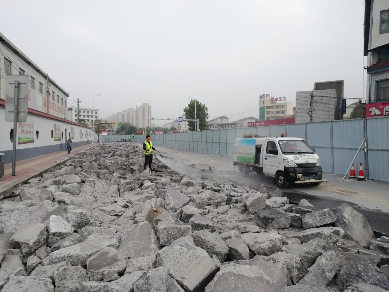 為了能趕在交通早高峰之前完成圍擋和封路,施工隊長張棟皓帶領(lǐng)施工人員凌晨就趕到了施工現(xiàn)場進(jìn)行施工。此次封路采取的是半幅封路半幅開通的方式,為的也是能把施工對道路暢通的影響降到最低。為防止揚(yáng)塵,破除混凝土之前以及混凝土塊外運的過程中安排了灑水車。
