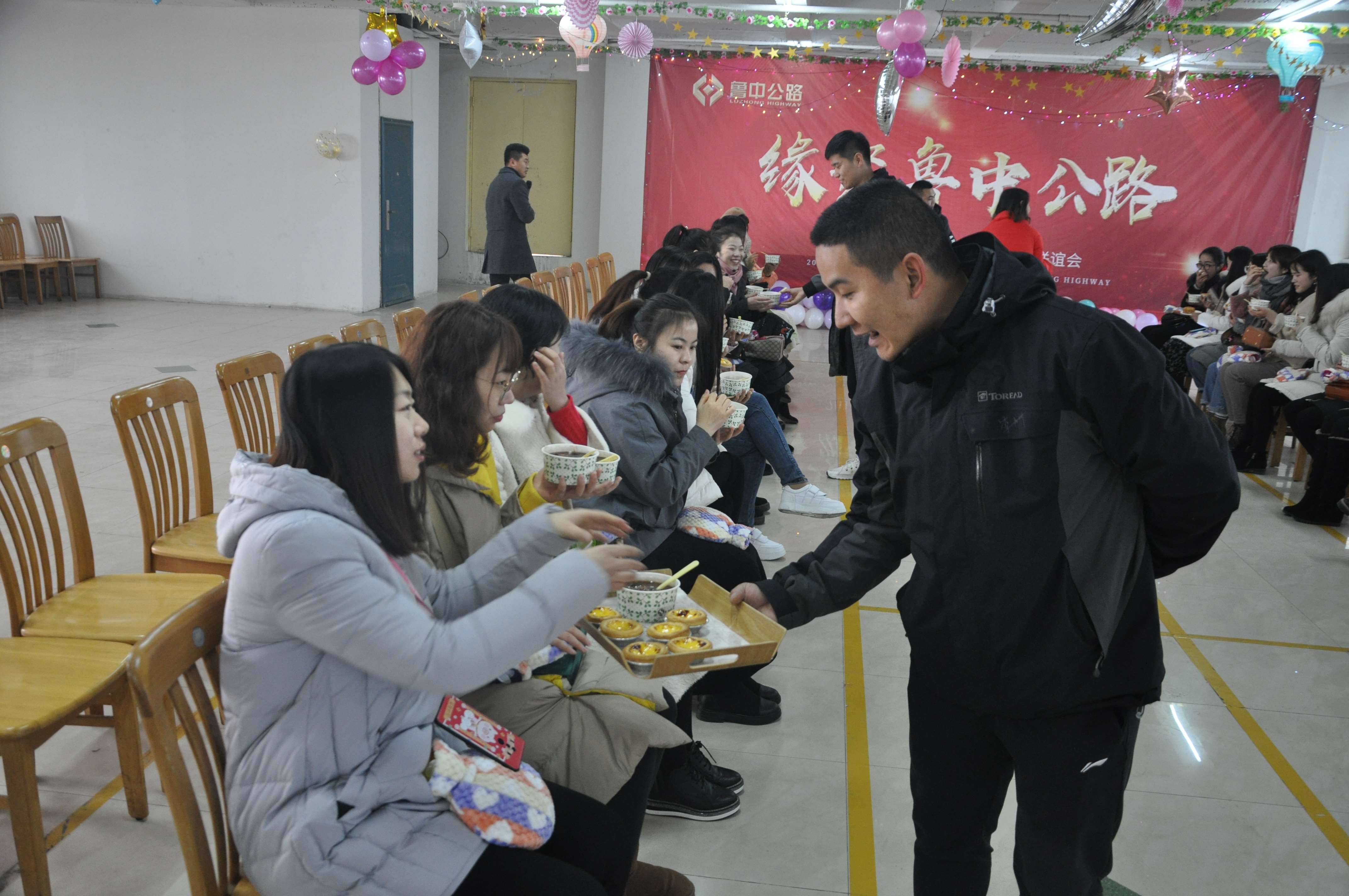 12:30分,原本有些陰霾的天氣,透出絲絲的陽光,映在臉上,照進(jìn)心間,女孩子們乘坐的大巴車一抵達(dá),小伙子們立即迎上去貼心的為女孩子們送上暖手袋。引入會(huì)場(chǎng)后,趕緊殷勤的捧上香濃美味的“臘八粥”,爭(zhēng)搶著上前遞上甜蜜的各式糕點(diǎn)。女孩子紛紛被小伙子們逗得漲紅了臉,笑彎了眼,隨著氣氛的逐漸活躍,大家也彼此熟絡(luò)起來。