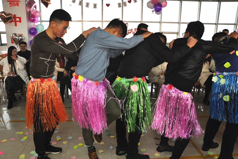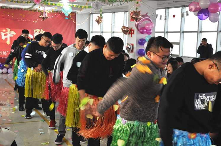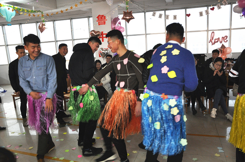 一個(gè)個(gè)游戲下來,聰明能干、呆萌踏實(shí)的小伙子們已經(jīng)打動(dòng)了姑娘們的芳心,但魯中公路小伙子的身上不僅僅只有這些亮點(diǎn),還有幽默、豁達(dá)、鮮活的另一面。隨著主持人的指令,手掌互動(dòng)的小游戲選出了需要被懲罰的人。小伙子們主動(dòng)請(qǐng)纓替女生受罰,身著草裙的他們開始“舞動(dòng)人生”。婀娜的舞姿、妖嬈的步伐引來全場(chǎng)的陣陣笑聲,把整個(gè)會(huì)場(chǎng)氣氛推向高潮。