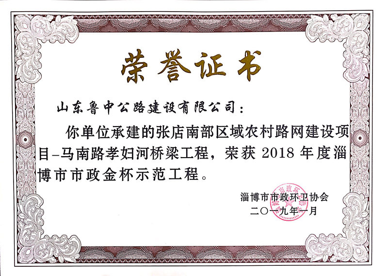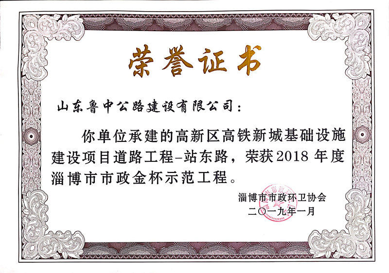 2019年1月,淄博市市政環(huán)衛(wèi)協(xié)會授予魯中公路2018年度“淄博市優(yōu)秀市政施工企業(yè)”、“淄博市市政工程質(zhì)量管理先進企業(yè)”榮譽稱號