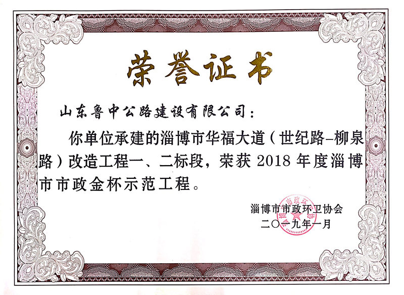 2019年1月,淄博市環(huán)衛(wèi)處授予魯中公路承建的華福大道改造工程施工一標段等四項工程市級“市政工程安全文明工地”榮譽稱號