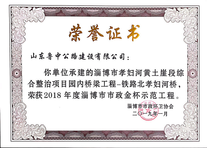 2019年1月,淄博市市政環(huán)衛(wèi)協(xié)會授予魯中公路承建的馬南路孝婦河橋梁工程、孝婦河懸索橋工程等四項工程市級“市政金杯示范工程”榮譽稱號
