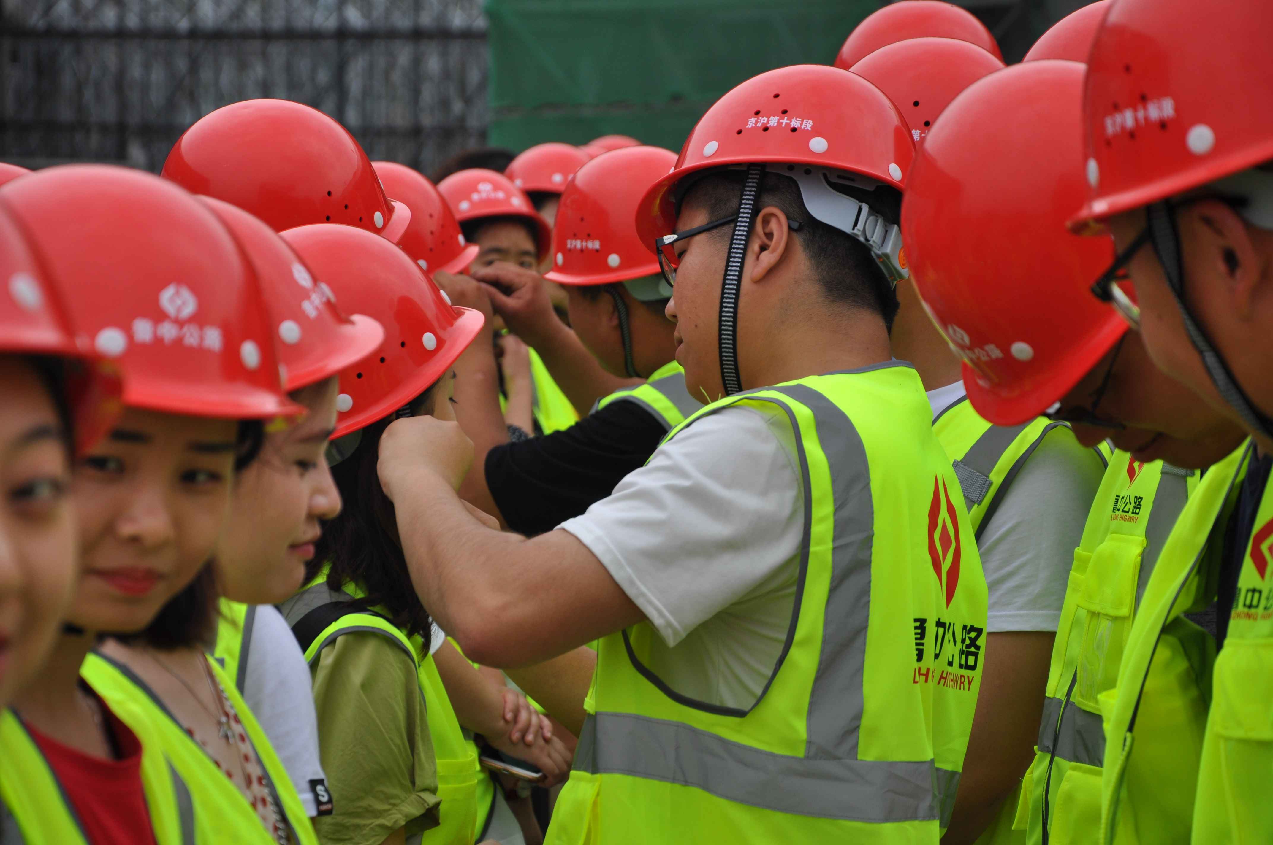 參觀完項(xiàng)目部,一行人再次登上大巴車(chē),前往G2紅花埠主線橋施工現(xiàn)場(chǎng),小伙子為小姑娘們戴好安全帽、穿好反光衣