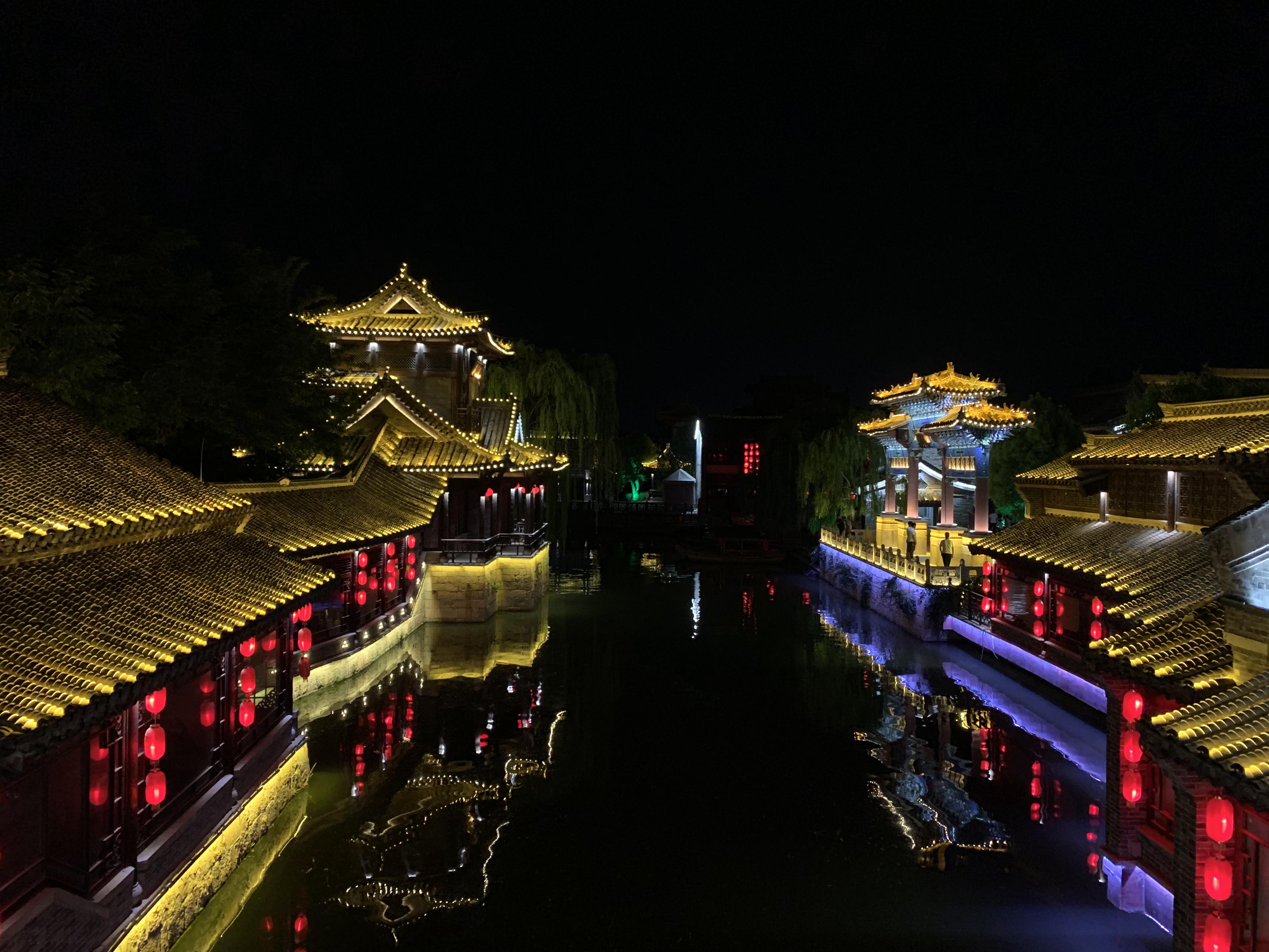 到了臺(tái)兒莊古城已是星光閃爍的時(shí)分,這座不夜的古城里面倒是熱鬧非凡,青石路上人群熙攘,湖面上蕩漾著游船,船篷上紅燈點(diǎn)點(diǎn),湖畔香樟樹(shù)隨風(fēng)輕擺,如夢(mèng)如幻。用過(guò)晚餐,年輕人們迫不及待的組隊(duì)去揭開(kāi)這古城的神秘面紗。