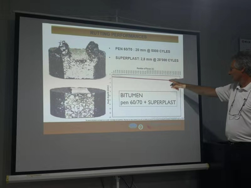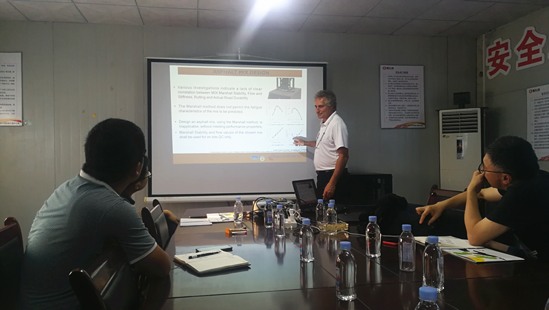 2019年7月15日意大利公路工程技術(shù)專(zhuān)家菲利普先生與市交通事業(yè)服務(wù)中心養(yǎng)護(hù)科,針對(duì)目前淄博重載交通、長(zhǎng)縱坡和高溫季節(jié)等極易出現(xiàn)車(chē)轍問(wèn)題,在山東魯中公路市政工程分公司進(jìn)行調(diào)研與工藝學(xué)術(shù)探討。