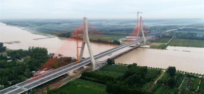 青蘭高速泰安至東阿段黃河特大橋工程,由山東高速集團投資建設(shè),全長3.9公里,主橋為雙塔中央索面斜拉橋,主塔高140米,主跨跨徑430米,采用鋼-混組合梁結(jié)構(gòu),是目前黃河上同類型橋梁中跨徑最大的一座,2015年12月開工建設(shè),較計劃提前3個月建成。