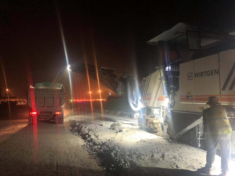 為保證完成2019年路面施工任務(wù),路面分部人員積極準(zhǔn)備,奮戰(zhàn)在施工第一線,每天夜晚及凌晨時施工場地?zé)艋鹜?,路面攤鋪機(jī)的轟鳴聲此起彼伏,數(shù)輛瀝青運輸車一字排開,雙鋼輪壓路機(jī)及膠輪壓路機(jī)正在路面上往來行駛,拌合站人員輪流堅守于工作崗位,隨時做好出料準(zhǔn)備,為路面施工提供充足的保障,兩臺銑刨機(jī)24小時不間斷工作,現(xiàn)場技術(shù)人員輪流值班,他們裹著大衣在各個施工設(shè)備間奔走,機(jī)械轟鳴,井然有序,為“魯中崛起、筑通天下”的公司理念燃燒著自己的青春。