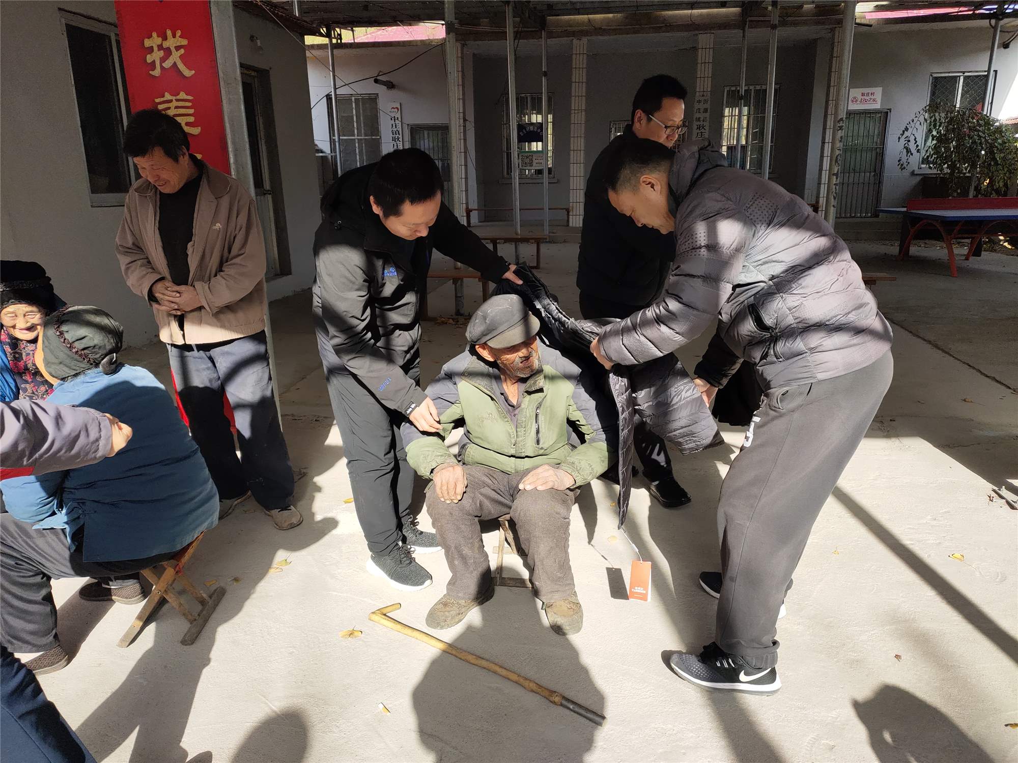 養(yǎng)護工程分公司黨支部書記黃衍剛、項目經(jīng)理王峰為村中最高壽(96歲)老人換上新衣