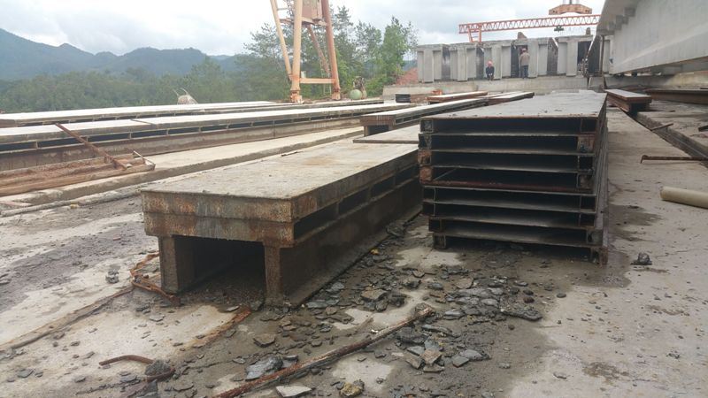 基礎澆筑完成后,開始進行20m箱梁的臺座組合安裝,首先安裝第一層縱向工字鋼(h=20cm、b=10cm),20m箱梁臺座鋪設3道縱向工字鋼,相鄰工字鋼外緣間距分別為50cm、60cm,固定前采用薄鋼板支墊工字鋼,調出梁板的預拱度,完成后采用膨脹螺栓固定,同時設置斜撐鋼筋防止傾倒,接著安裝第二層橫向槽鋼(h=5cm、b=3.7cm),,槽鋼長度為60cm,間隔30cm設置一道,與工字鋼密點焊固定,第二層槽鋼完成后,即可鋪設第三層定型槽鋼支架鋼板,并與槽鋼密點焊固定。至此20m箱梁組合鋼構臺座安裝完成,對預拱度、平整度、線型等指標檢測驗收合格后即可投入生產(chǎn)。25m箱梁底寬同20m箱梁,均為1m,適當調整預拱度后即可使用。