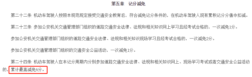 第二十四條 機動車駕駛?cè)嗽诒居浄种芷趦?nèi)分別參加道路交通安全法律、法規(guī)和相關(guān)知識網(wǎng)上、現(xiàn)場學(xué)習(xí)考試或者交通安全公益活動的,累計最高減免6分。