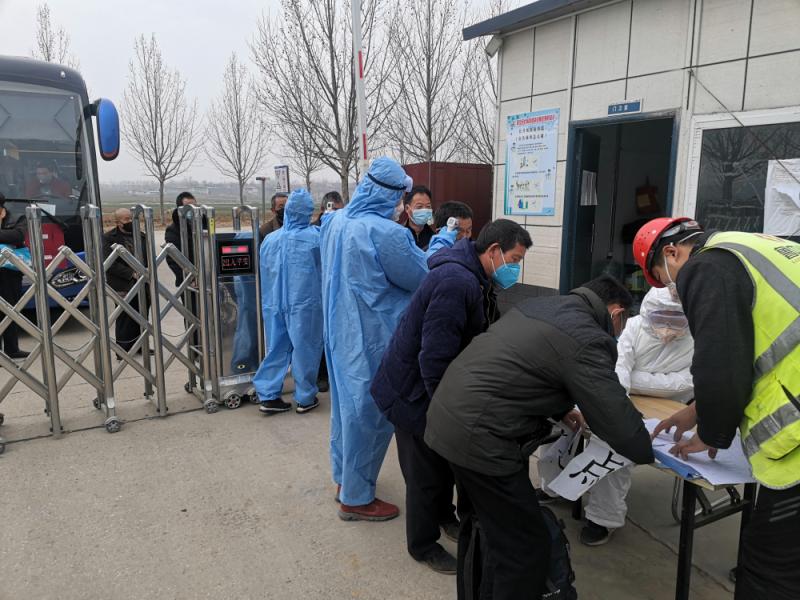 上午10時(shí)30分,第一輛張貼“魯中公路新寧高速第二標(biāo)段農(nóng)民工返崗專車”標(biāo)志的大巴車緩緩駛停二分部華豐鎮(zhèn)高莊預(yù)制場(chǎng)門前,這是新寧高速第二標(biāo)段首次包車接返農(nóng)民工。返崗人員下車后,由工作人員逐一進(jìn)行體溫檢測(cè)、登記,并現(xiàn)場(chǎng)簽訂新冠肺炎疫情防控承諾書和返崗信息卡等,手續(xù)辦理齊全后陸續(xù)進(jìn)入拌合站工作場(chǎng)所。