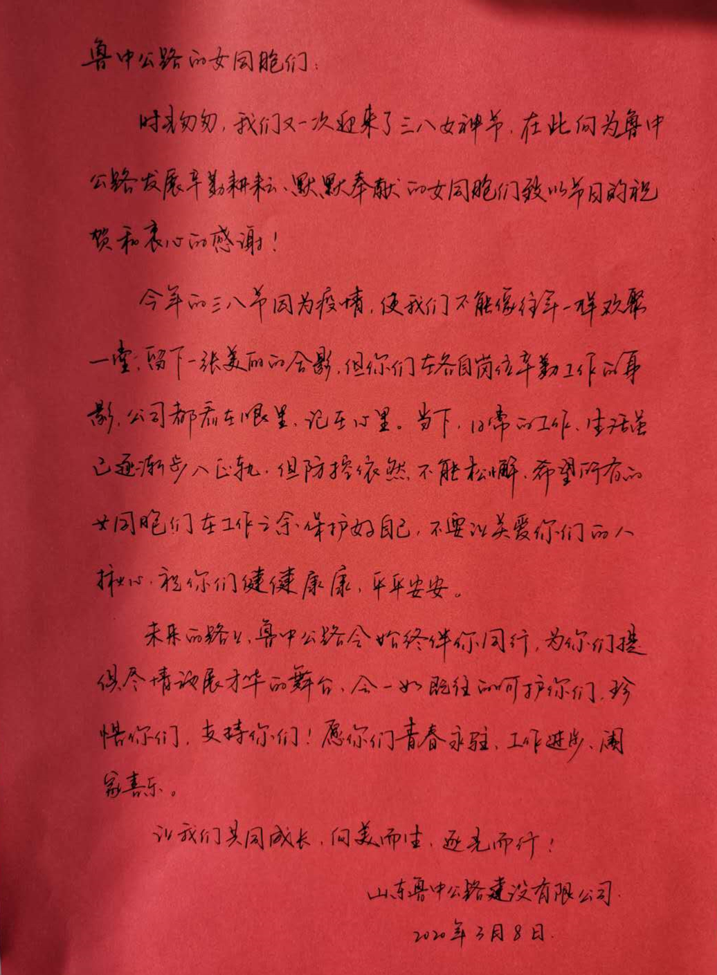 能加入公路人隊(duì)伍的女孩子,都是些勇氣可嘉、心有抱負(fù)的可愛姑娘,行業(yè)性質(zhì)決定了她們有木蘭一樣的決心和仗劍走天涯的灑脫。也因此,一年一度的“三八節(jié)”對魯中公路女員工來說,總是別有一番意義,每年這一天,大家會從各自的工地、崗位團(tuán)聚到一起,嘮嘮工作趣談,看看彼此變化,聊聊未來愿望。今年,由于疫情原因,熱熱鬧鬧的聚會無法實(shí)現(xiàn),但公司早早的為全體女員工精心準(zhǔn)備了禮物與慰問信,向疫情期間仍在崗位上奮斗的女同胞們表示衷心感謝和節(jié)日的祝賀。