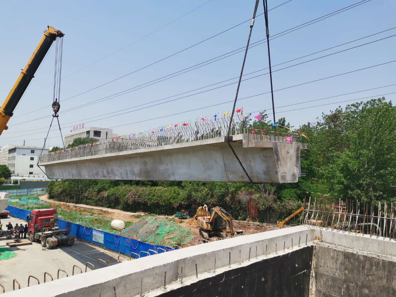 5月21日清晨,隨著機(jī)器的轟鳴聲,南崔路分離式立交橋箱梁成功的到達(dá)了現(xiàn)場(chǎng),在項(xiàng)目部和總監(jiān)辦相關(guān)人員的指導(dǎo)下完成了1-1、1-2、1-3等箱梁的吊裝工作,經(jīng)現(xiàn)場(chǎng)人員及監(jiān)理工程師對(duì)其檢測(cè)均符合規(guī)范及設(shè)計(jì)要求。