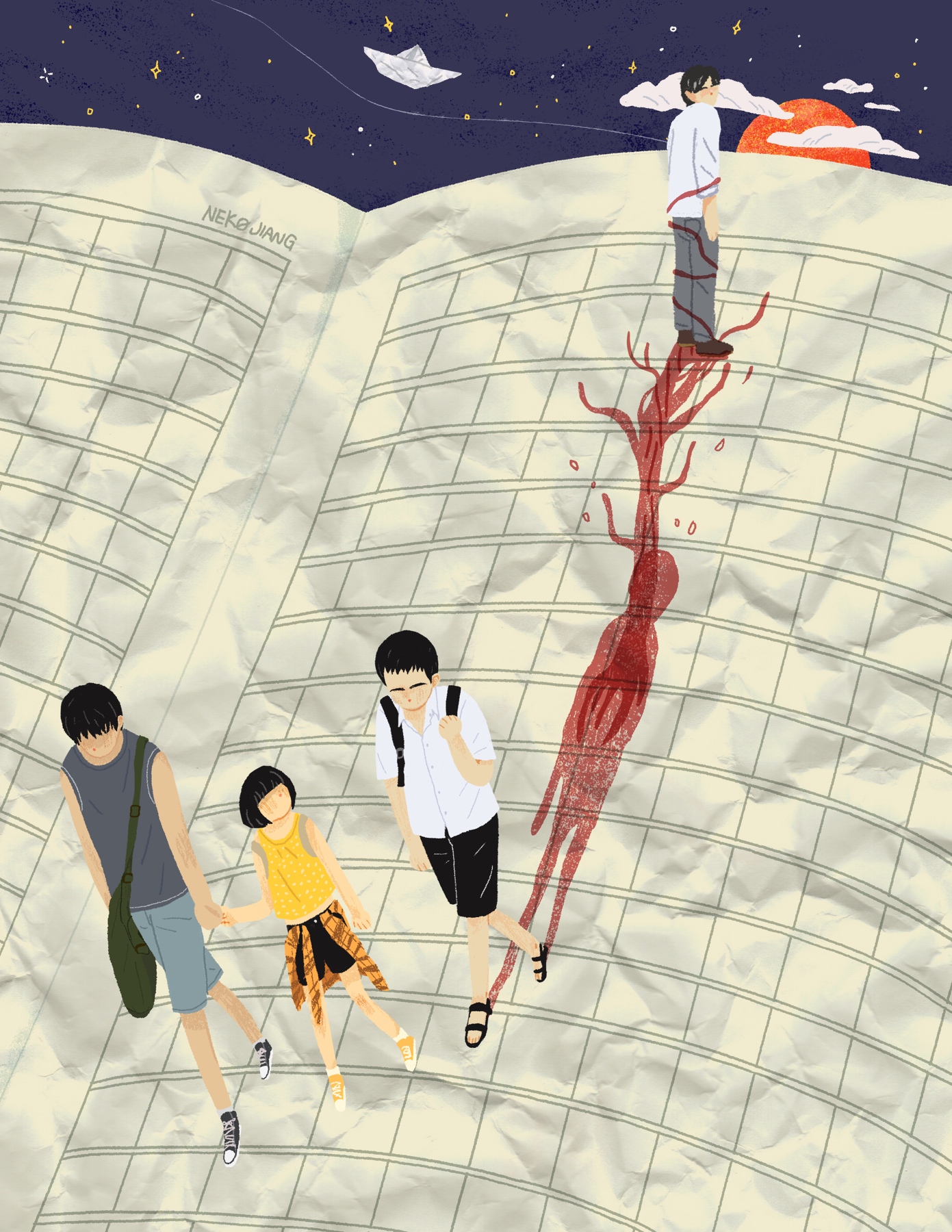 小說開篇即是張東升在妻子出軌決議離婚之后,在隱忍了一年,計(jì)劃了一年時(shí),毫不猶豫的將自己的岳父母從山上推了下去。本來這會(huì)是一場(chǎng)完美犯罪,缺意外的被三個(gè)游玩的小孩子錄到了視頻中。朱朝陽(yáng)本想報(bào)警,卻被普普阻止,她想勒索張東升,用勒索到的錢和丁浩成長(zhǎng)到成年。在這時(shí),朱朝陽(yáng)還是一個(gè)規(guī)規(guī)矩矩的乖孩子,轉(zhuǎn)折點(diǎn)發(fā)生在意外殺死朱晶晶之后。為避免其他兩個(gè)人將他殺人的事情說出去,只能同意勒索之事,這是朱朝陽(yáng)邁向黑暗的第一步,之后的事情更加不受控制:要挾張東升將自己父親和后媽殺害;為盡早繼承遺產(chǎn)挖出尸體的一角;在明知道張東升要?dú)⑺雷约汉突锇槿藭r(shí),袖手旁觀,最終獨(dú)自存活。推動(dòng)所有事件的朱朝陽(yáng),卻在最后憑借一本“長(zhǎng)高秘籍”和編造的日記本逃脫嫌疑,不得不敬佩這位少年的心智之高。