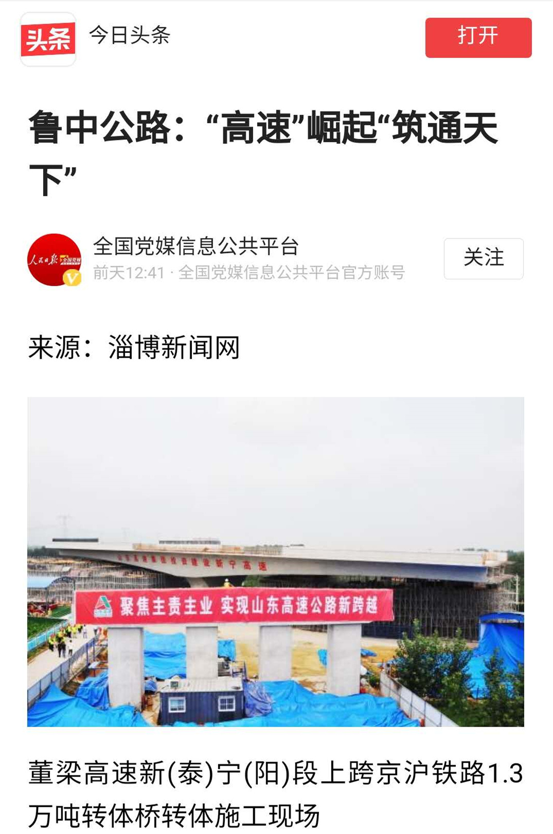 2020年7月30日,《淄博日?qǐng)?bào)》4版刊登了題為《董梁高速新(泰)寧(陽(yáng))段上跨京滬鐵路1.3萬(wàn)噸轉(zhuǎn)體橋成功轉(zhuǎn)身,淄博路企“走出去”再豎里程碑——魯中公路:“高速”崛起“筑通天下”》的文章。