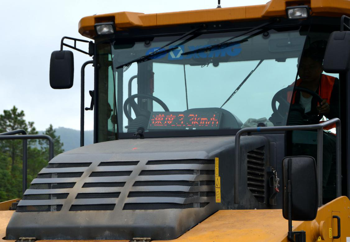 監(jiān)控系統(tǒng)工作原理是壓路機(jī)行駛速度由GPS裝置進(jìn)行監(jiān)測,碾壓溫度由壓路機(jī)下的溫度測量裝置監(jiān)測,同時連接機(jī)頂?shù)腖ED屏幕,將監(jiān)測數(shù)據(jù)在屏幕上即時、直觀的顯示出來,攤鋪機(jī)在腳踏板下方安裝溫度監(jiān)控設(shè)備,實時將溫度信息公布至攤鋪機(jī)上方的LED顯示屏。此監(jiān)控系統(tǒng)有助于現(xiàn)場施工管理人員直觀的監(jiān)控碾壓速度和碾壓溫度,對不符合指標(biāo)情況及時處理,為路面施工質(zhì)量和安全生產(chǎn)提供了有利條件。監(jiān)控系統(tǒng)數(shù)據(jù)的直觀顯示,提高了管理人員和機(jī)械操作手的標(biāo)準(zhǔn)化施工意識,嚴(yán)格控制攤鋪速度和碾壓溫度,在路面施工搶抓進(jìn)度的同時,也對施工質(zhì)量做到精細(xì)管理。
