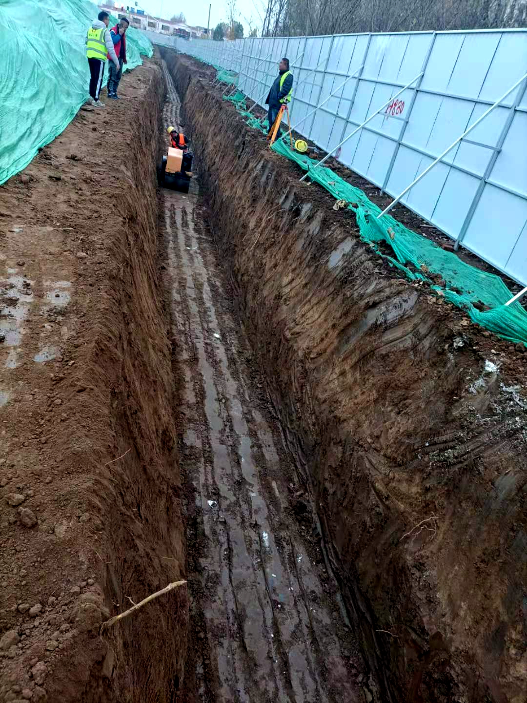 考工路項目工程是淄博新經(jīng)開區(qū)成立后我公司第一個中標(biāo)的工程項目,公司各級領(lǐng)導(dǎo)及項目部人員高度重視,自進(jìn)場以來,項目部多次召開調(diào)度會議,倒排工期,確保工程如期完成。在保證進(jìn)度的同時項目部也狠抓安全文明施工,考工路項目業(yè)主要求使用2.5m高圍擋,并在圍擋上方設(shè)置抑塵噴淋裝置。項目部人員自11月9日進(jìn)場,迅速組織力量進(jìn)行圍擋支設(shè)工作,并嚴(yán)格按照要求進(jìn)行支設(shè);開工伊始,天氣便反復(fù)無常,雨雪天氣交加,重污染天氣致使工地多次停工,但工期計劃并不等人,土方外運(yùn)工作如不能按時完成,后期的施工將很難開展。為打贏時間戰(zhàn),項目部決定夜間進(jìn)行土方運(yùn)輸,早晨再將被運(yùn)輸污染路面用山貓進(jìn)行清掃,同時用灑水車進(jìn)行沖洗。