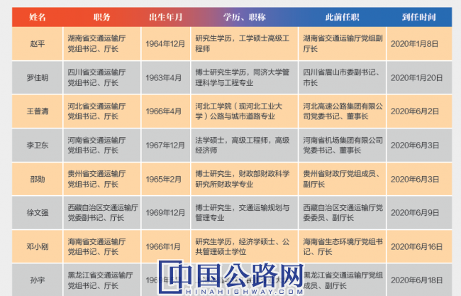 2020年全國13位新任職交通運輸廳(委)主官基本概況