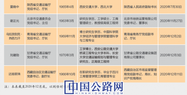 2020年12月內(nèi),全國3位新任交通運輸廳“一把手”到任。12月2日,經(jīng)青海省第十三屆人民代表大會常務(wù)委員會第二十二次會議通過,任命烏拉孜別克·熱蘇力汗為交通運輸廳廳長。在緊接著的12月3日,青海的鄰省甘肅也決定了任命劉建勛為交通運輸廳廳長。12月11日,西藏自治區(qū)政府、區(qū)黨委組織部宣布,決定任命達(dá)娃歐珠同志為西藏自治區(qū)交通運輸廳黨委書記、副廳長。