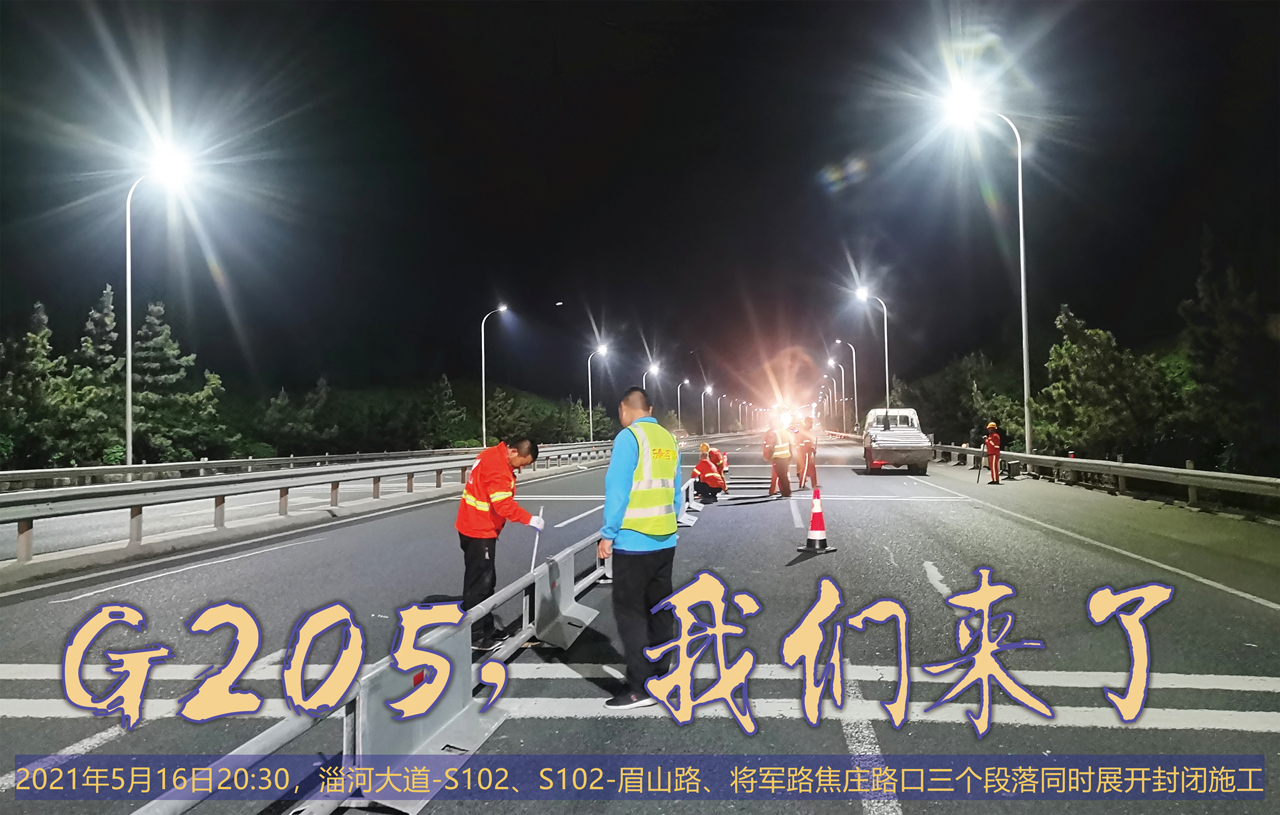 5月16日20:30,淄河大道-S102、S102-眉山路、將軍路焦莊路口三個段落同時展開封閉施工。經(jīng)過近8個小時的連續(xù)作業(yè),一次完成封閉段落10公里。