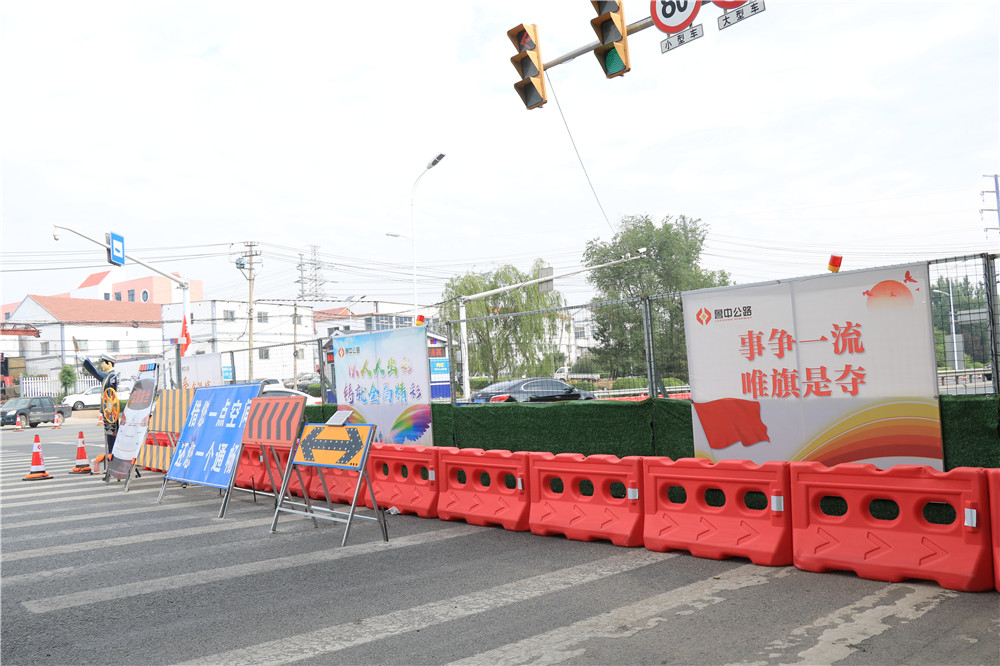 G205項(xiàng)目車流量大、交通形式復(fù)雜,交通組織是工程實(shí)施期間的頭等大事。項(xiàng)目部嚴(yán)格按規(guī)范要求布設(shè)交通封閉設(shè)施,細(xì)化交通提示牌和指示標(biāo)志,先后設(shè)置遠(yuǎn)端提示牌25塊,各類標(biāo)識(shí)標(biāo)牌近500塊,投入安全錐12000余個(gè),水碼1000余個(gè)。項(xiàng)目部組成50余人的安全隊(duì)伍負(fù)責(zé)交通疏導(dǎo),確保了施工期道路安全暢通,最大限度地降低了對(duì)群眾出行的影響。自開工以來,車輛往來秩序井然,周邊群眾出入正常有序,未發(fā)生一起因道路施工引起的交通擁堵和交通事故。