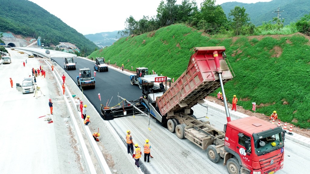 2021年6月23日,在位于四川省巴中市通江縣境內(nèi)的鎮(zhèn)(陜西省鎮(zhèn)巴縣)廣(四川省廣安市)高速王坪至通江段,無(wú)人自動(dòng)化攤壓設(shè)備正在施工作業(yè)。