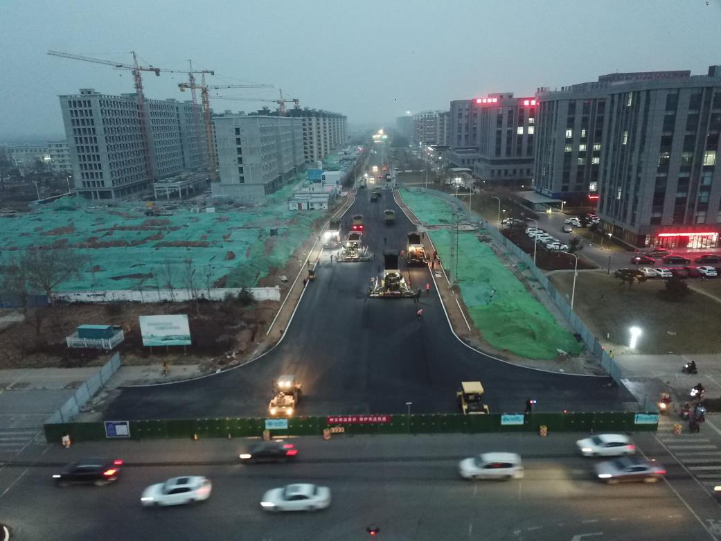 柳園路聯(lián)通路路口作為北郊鎮(zhèn)重要交通路口,施工期間先遇環(huán)保應(yīng)急響應(yīng),又遇強(qiáng)寒潮天氣,若等待寒潮結(jié)束后基本無(wú)條件可施工。周村EPC項(xiàng)目部與合作商協(xié)調(diào)溝通達(dá)成一致,在應(yīng)急響應(yīng)解除時(shí)立即組織人員機(jī)械進(jìn)場(chǎng)進(jìn)行瀝青上面層施工,增加設(shè)備投入。利用短暫的時(shí)間完成施工任務(wù),并采用了4臺(tái)攤鋪機(jī)同時(shí)前進(jìn)施工,施工現(xiàn)場(chǎng)相當(dāng)壯觀。