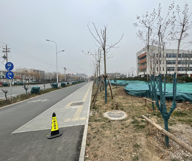 強(qiáng)寒潮伴有明顯大風(fēng)現(xiàn)象,周村EPC項(xiàng)目部立即對(duì)各道路現(xiàn)況作出風(fēng)險(xiǎn)分析,組織人員進(jìn)行圍擋加固并對(duì)柳園路人民路路口的綠化進(jìn)行防寒處理,避免造成相應(yīng)損失。同時(shí)對(duì)綠化苗木進(jìn)行修剪枝葉,并使用防寒無(wú)紡布包裹,抵抗寒潮。