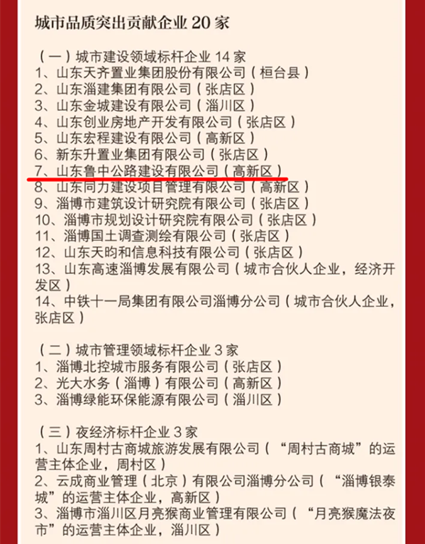 2022年2月7日,淄博市召開全市品質(zhì)提升年動(dòng)員大會(huì),淄博市委副書記、市長(zhǎng)馬曉磊主持會(huì)議。會(huì)議通報(bào)了2021年我市支持企業(yè)發(fā)展的各項(xiàng)政策落實(shí)情況,宣讀了淄博市委、市政府關(guān)于表彰“落實(shí)突破年”和鄉(xiāng)村振興工作先進(jìn)集體和先進(jìn)個(gè)人的決定。會(huì)上,還為新經(jīng)濟(jì)引領(lǐng)、產(chǎn)業(yè)強(qiáng)市、科技創(chuàng)新、金融賦能突出貢獻(xiàn)企業(yè)代表,為外貿(mào)投資、生態(tài)文明、文旅繁榮、城市品質(zhì)、社會(huì)責(zé)任九大領(lǐng)域選樹的200家突出貢獻(xiàn)企業(yè)(單位)代表頒獎(jiǎng)。其中,山東魯中公路建設(shè)有限公司榮獲城市品質(zhì)突出貢獻(xiàn)企業(yè)榮譽(yù)。
