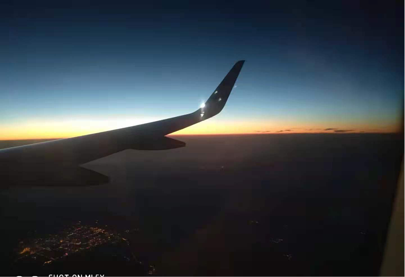 這張照片拍攝時間是2018年6月14日,也是在我出差途中拍攝。當時從濟南遙墻機場飛至贛州黃金機場,飛機起飛沒多長時間,天空便暗了下來。當大地擁抱黑暗的時候,在大地與天空的地平線上,顯現(xiàn)了如此的景色。地平線以上先是太陽落山退卻的黃色,再慢慢漸變成藍色,再由藍色漸變成黑色,飛機下方城市的燈光正好似天上的夜市。感嘆于景色的同時,拿起手機記錄下。