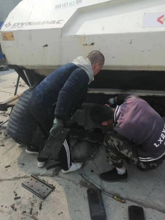 為攤鋪機更換履帶橡膠板,拆下來的螺絲能用的全部用上,杜絕浪費,節(jié)約費用。