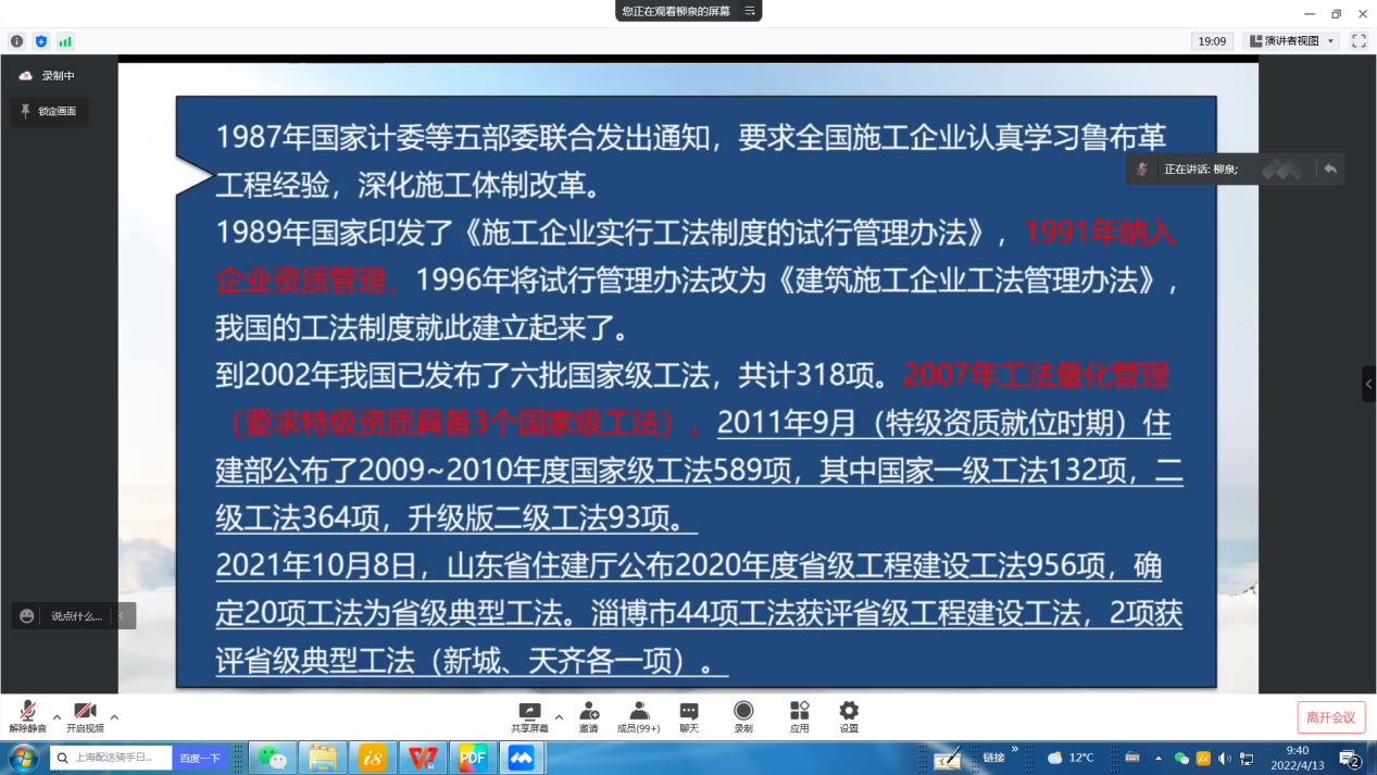 4月13日,公司總部以及各區(qū)域生產(chǎn)單位的技術人員、管理人員等共計25人參加了淄博市住建局組織的工法培訓視頻會議。