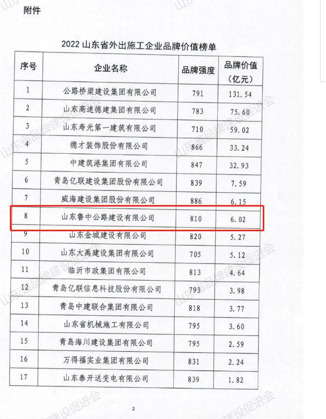 1月6日,2022年度山東省外出施工企業(yè)品牌價值評價榜單正式發(fā)布。魯中公路品牌價值6.02億和品牌強(qiáng)度810,排在榜單第8位。