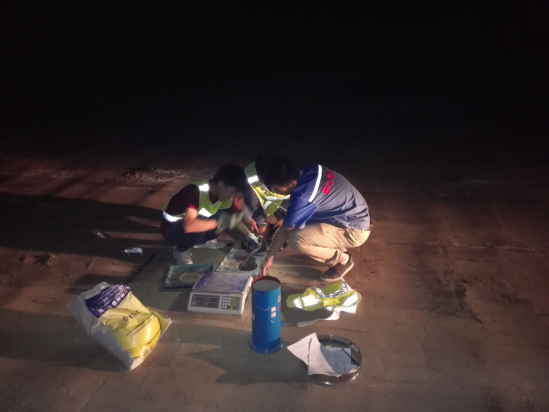 凌晨兩點二十分,借著車燈檢測路基壓實度的質檢員袁建波、宋喜才、武向東。