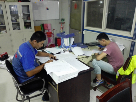 凌晨一點五十分,為了準備檢驗資料還在奮筆疾書的資料員們。