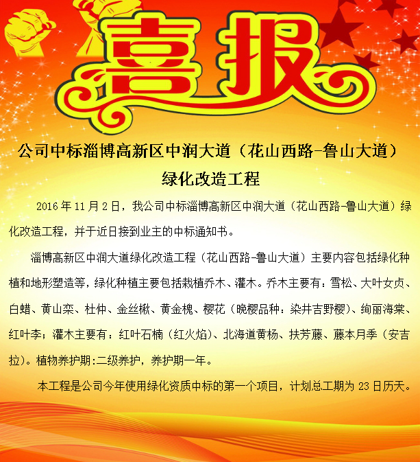 公司中標淄博高新區(qū)中潤大道(花山西路-魯山大道)綠化改造工程