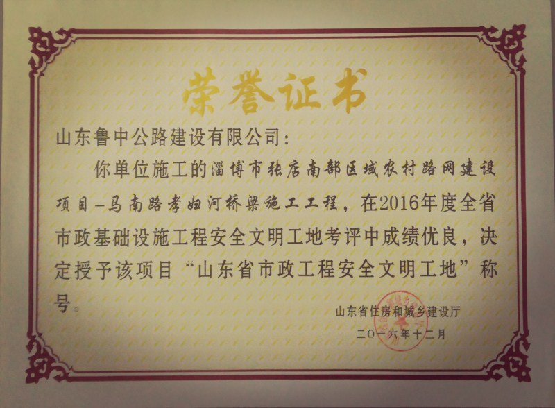 1月3日,經(jīng)確認(rèn),由我山東魯中公路建設(shè)有限公司承建的“淄博市張店南部區(qū)域農(nóng)村路網(wǎng)建設(shè)項目—馬南路孝婦河橋梁工程項目”被山東省住房和城鄉(xiāng)建設(shè)廳授予“山東省市政工程安全文明工地”榮譽稱號,在新年伊始便迎來了2017年的開門紅。