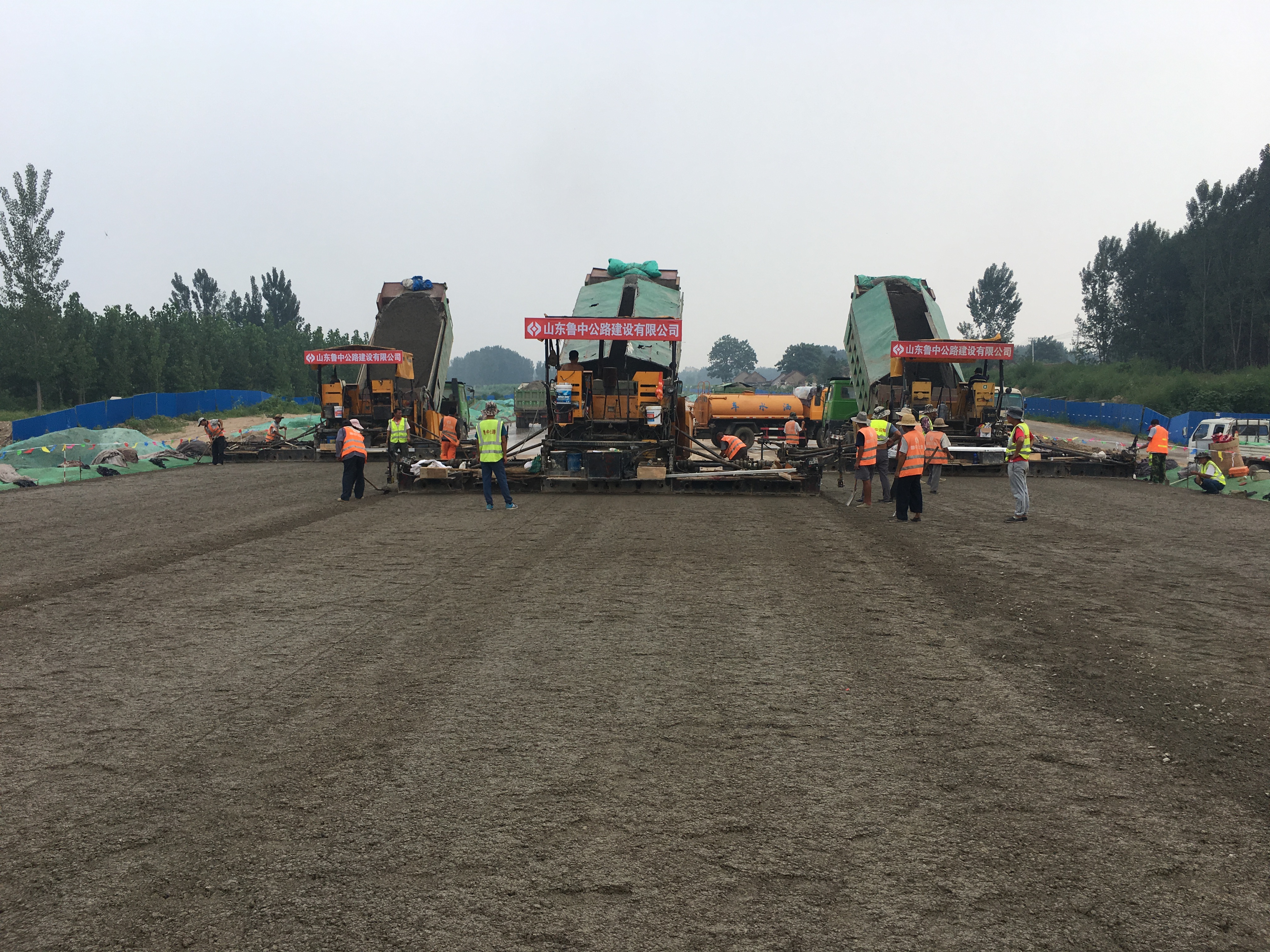 淄河大道施工現(xiàn)場三臺設備呈“U”型同時攤鋪