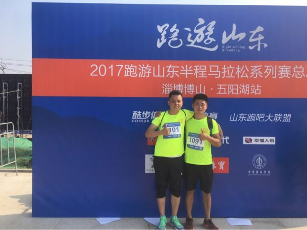 我們到達(dá)博山“五陽湖”賽場時(shí)大霧還未散盡,在完成打印報(bào)名表、領(lǐng)服裝、別號(hào)牌、換統(tǒng)一的黃T恤等一系列的賽前準(zhǔn)備后,羅漢濤和王威智進(jìn)行了簡單的熱身運(yùn)動(dòng)。