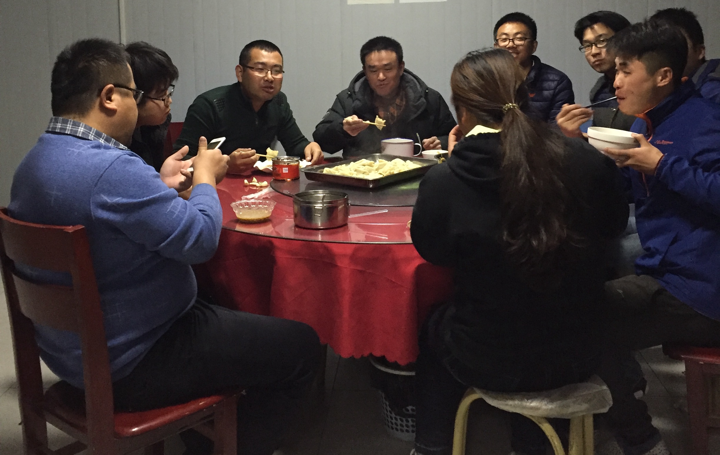 冬天是寒冷的,但這樣一個溫暖的大家庭里讓我們感受到暖暖的春意。一盤盤熱氣騰騰的餃子端上桌了,大家圍坐在桌邊,品嘗著自己的勞動果實、笑談某人包餃子的水平如何。談笑間,夜幕降臨,每個人都拿起手機與家中的親人表達節(jié)日的祝福、訴說無法團聚的遺憾,和親人分享自己在工地過節(jié)體驗。