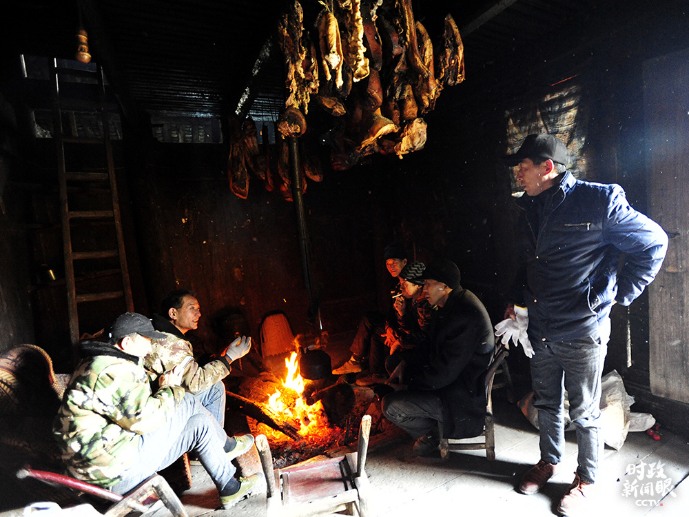 漁山村村民在自家屋里熏制臘肉,圍爐交談。