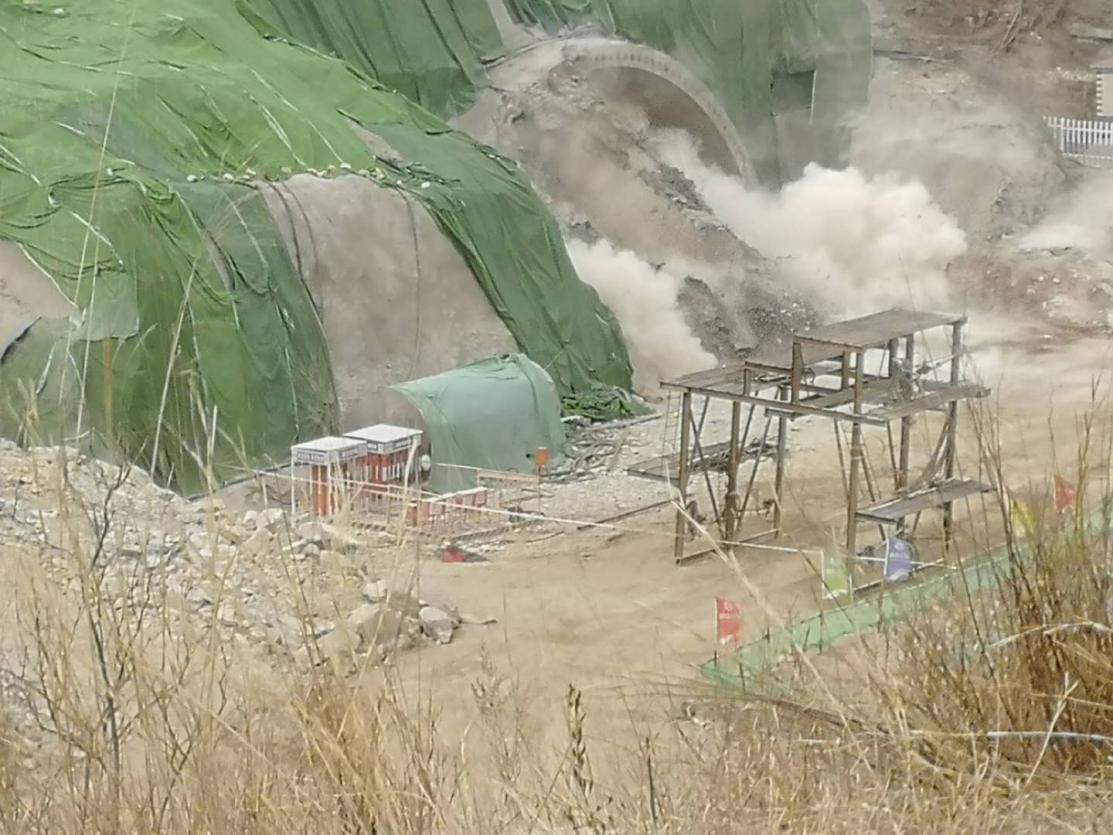 按照爆破器材采用相關(guān)要求,上午9時(shí),炸藥及雷管有序進(jìn)場,現(xiàn)場負(fù)責(zé)人對進(jìn)場爆破材料進(jìn)行清點(diǎn)無誤后,卸到合適位置備用。爆破前,做好爆破施工的班前交底會,對現(xiàn)場會出現(xiàn)的狀況及處理措施進(jìn)行提前告知,保證現(xiàn)場的安全,派出所出警對現(xiàn)場安全組織情況進(jìn)行檢查和指導(dǎo),拉好警戒線,確保安全。爆破人員按照規(guī)定位置安放炸藥及雷管,10點(diǎn)48分,虎山隧道右洞進(jìn)洞第一炮順利起爆,經(jīng)過合理時(shí)間等待后,爆破人員進(jìn)行安全排查,之后挖掘機(jī)、裝載機(jī)進(jìn)入洞口進(jìn)行出渣施工。